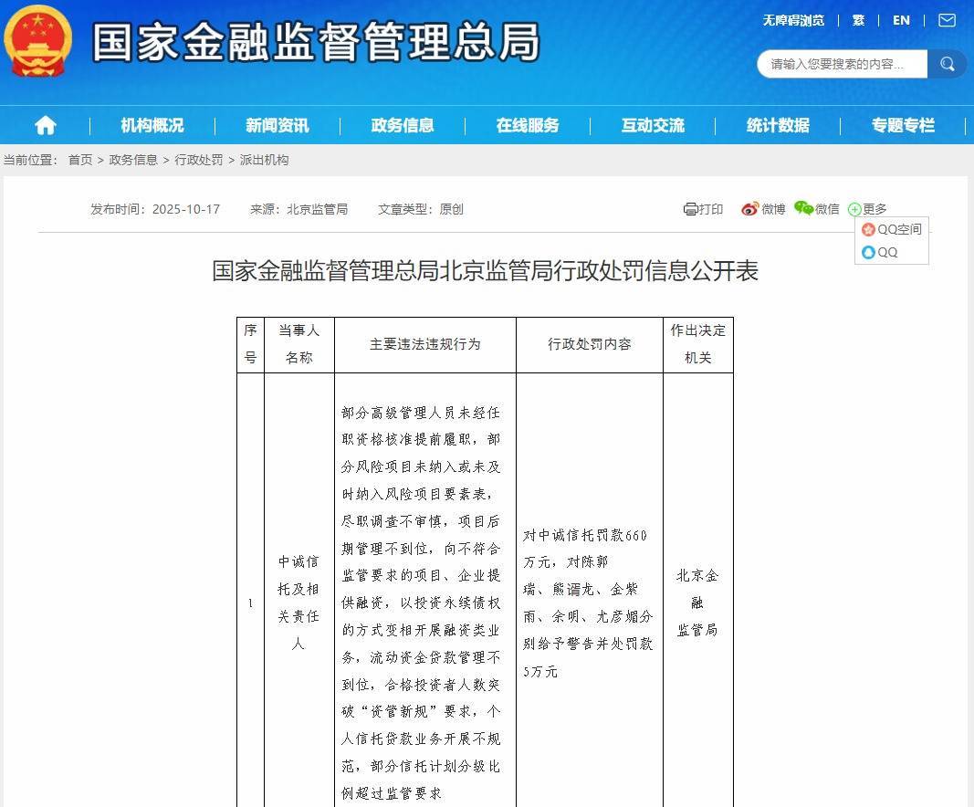 【大河财立方消息】10月17日七星配资,北京金融监管局公布行政处罚信息公开表七星配资,对中诚信托罚款660万元,对相关责任人陈郭瑞、熊谞龙、金紫雨、余明、尤彦媚分别给予警告并处罚款5万元。