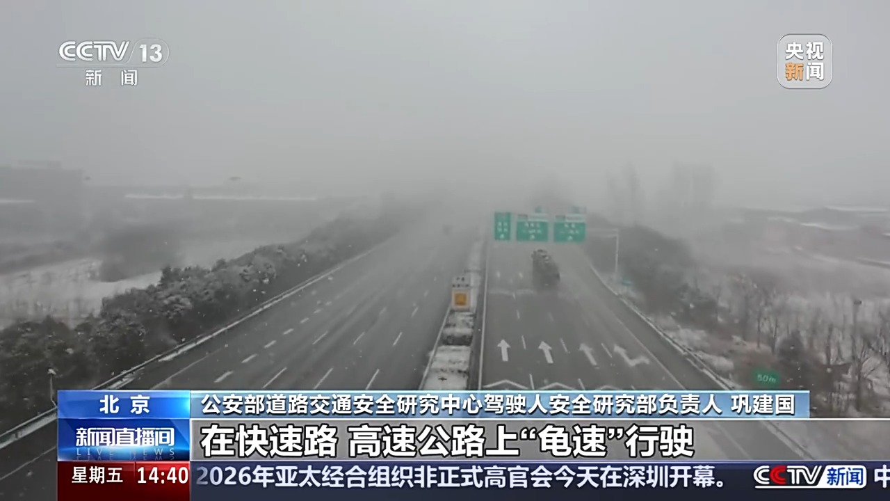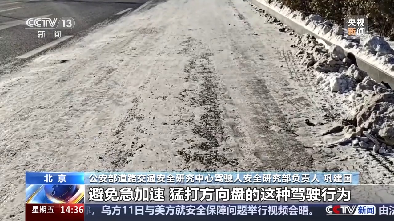 公安部道路交通安全研究中心驾驶人安全研究部负责人 巩建国:一般而言,干燥的沥青路面的附着系数在0.8左右,压实的积雪路面附着系数在0.2左右,而结冰路面它的附着系数在0.1左右。也就是说,在同样的速度下,冰雪路面的制动距离有可能是干燥路面的4倍以上。