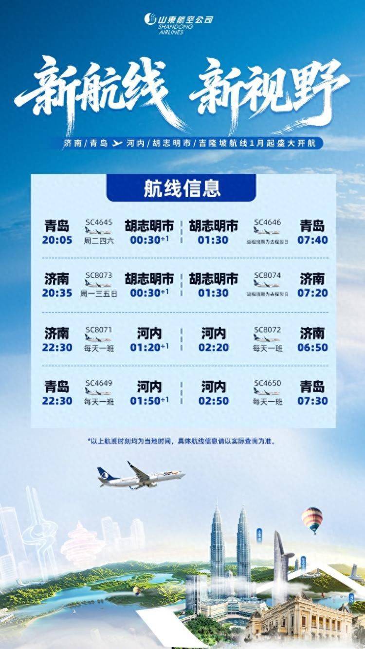 2026年1月起,山东航空将正式开通由济南、青岛往返越南河内、胡志明市以及马来西亚吉隆坡的直飞航线。山航将进一步满足我国多地与东南亚之间日益频繁的人员往来需求,为双方交流提供更便捷的交通保障。