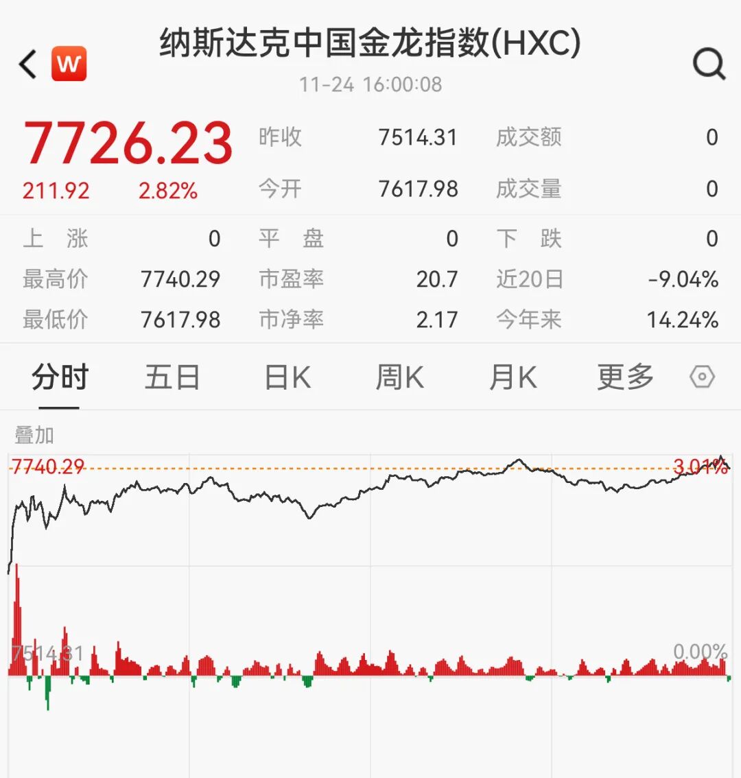 当地时间11月24日(周一),美股继续反弹,道指收涨0.44%,标普500指数收涨1.55%,纳指收涨2.69%;纳斯达克中国金龙指数大涨2.82%。
