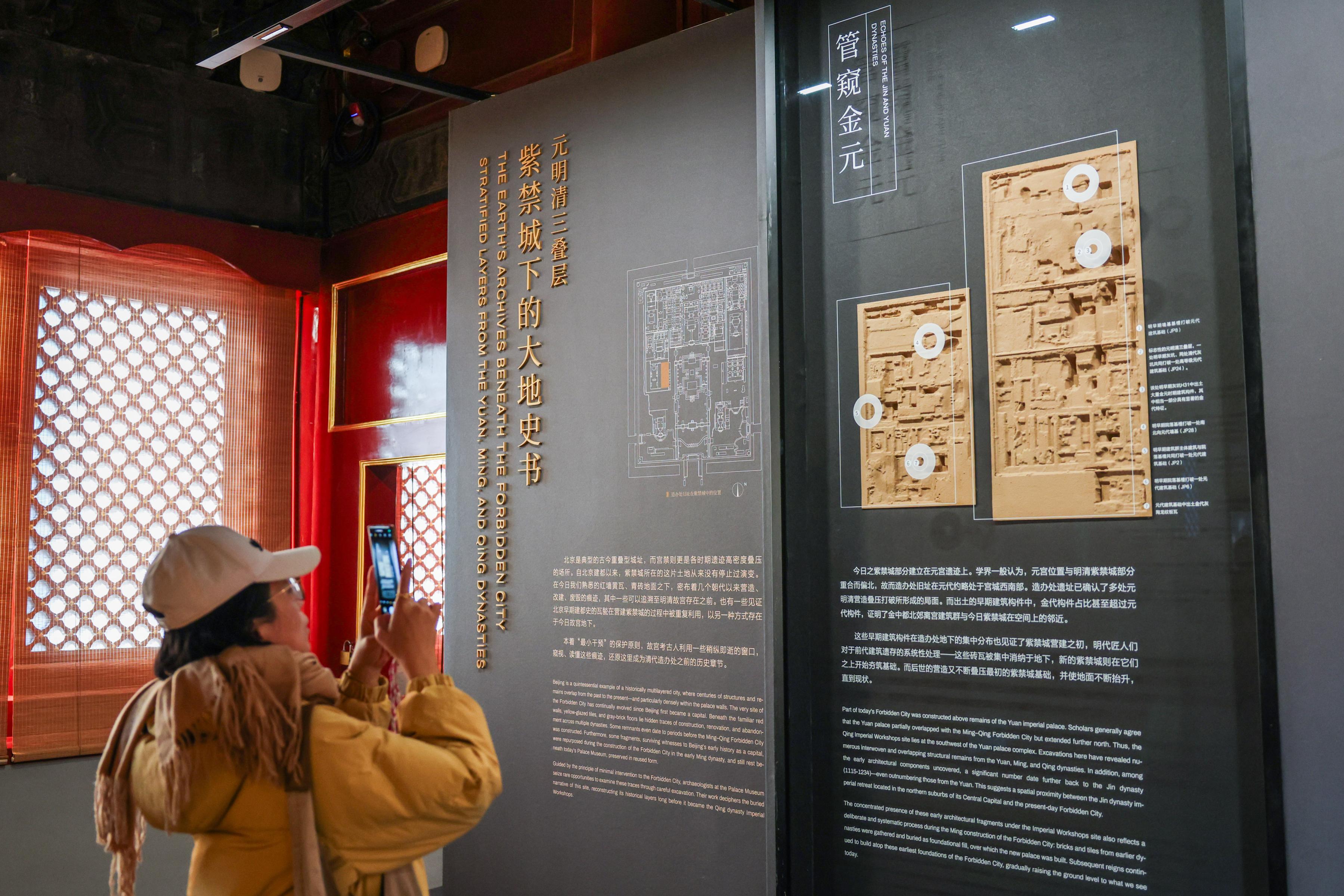明代并非在白地营造紫禁城,匠人首先清理了大量“古建”。绝大多数前朝既有建筑被拆毁,渣土用于平整场地。此次出土了大量金元时期的砖瓦、石板等建筑构件。观众可以在展厅与这些紫禁城最早的“居民”相遇。